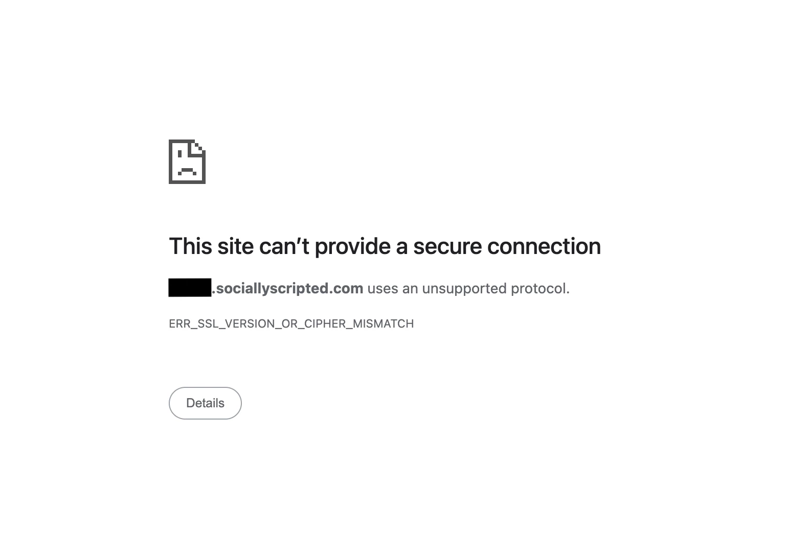 My Squarespace DNS CNAME is set to ssl.honeybook.com and my HoneyBook domain status shows as "Active," but I'm still getting the ‘ERR_SSL_VERSION_OR_CIPHER_MISMATCH’ error when loading the subdomain. I've been trying to find a resolution for a few hours with no success.