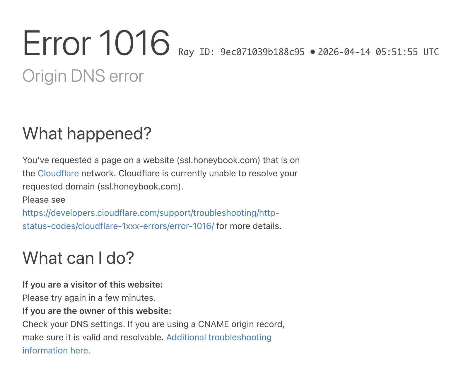 UPDATE: I figured I'd try loading ssl.honeybook.com directly, which is the custom data field we enter in our DNS settings to use a custom subdomain in HoneyBook. I discovered that ssl.honeybook.com itself is returning a ‘Cloudflare Error 1016’ (Origin DNS error), which suggests this may be a HoneyBook infrastructure issue rather than anything on the user side.
