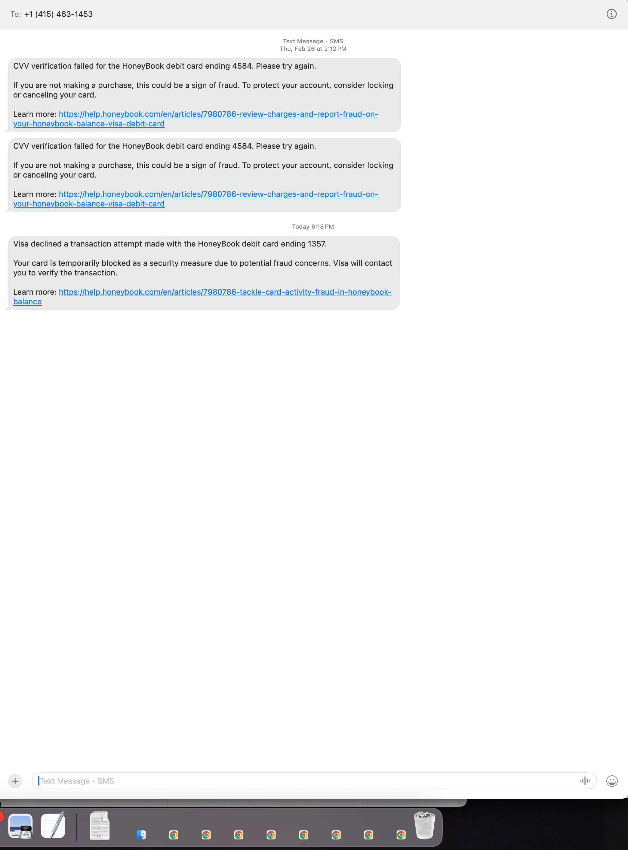 In the past week and a half, I've had two separate fraud attempts on my HoneyBook Balance debit card. I don't use this card for shopping or transactions at all, I only have it because it's the only way to transfer money out to my actual business bank account. So imagine my surprise getting texts like this out of nowhere: