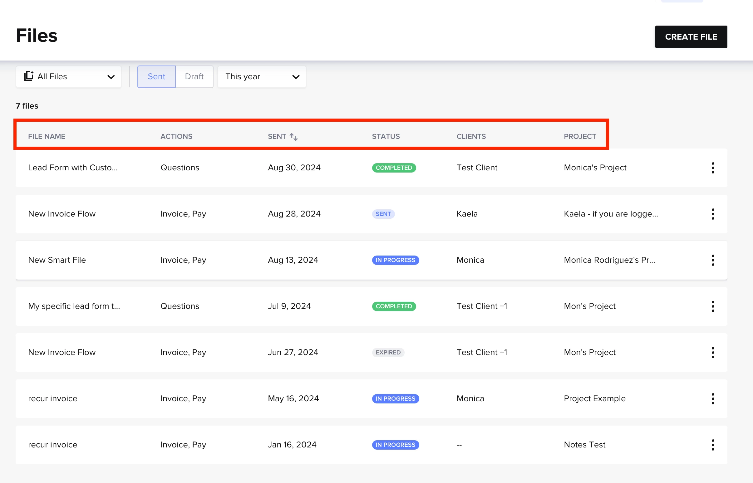 The new files tab now shows all your files, both that have been sent or are in draft all in one place. For each file you can see which actions are available in the file, the date is was sent or last edited, the status of the file’s progress, the clients who were sent the file, as well as the project the file was sent in!