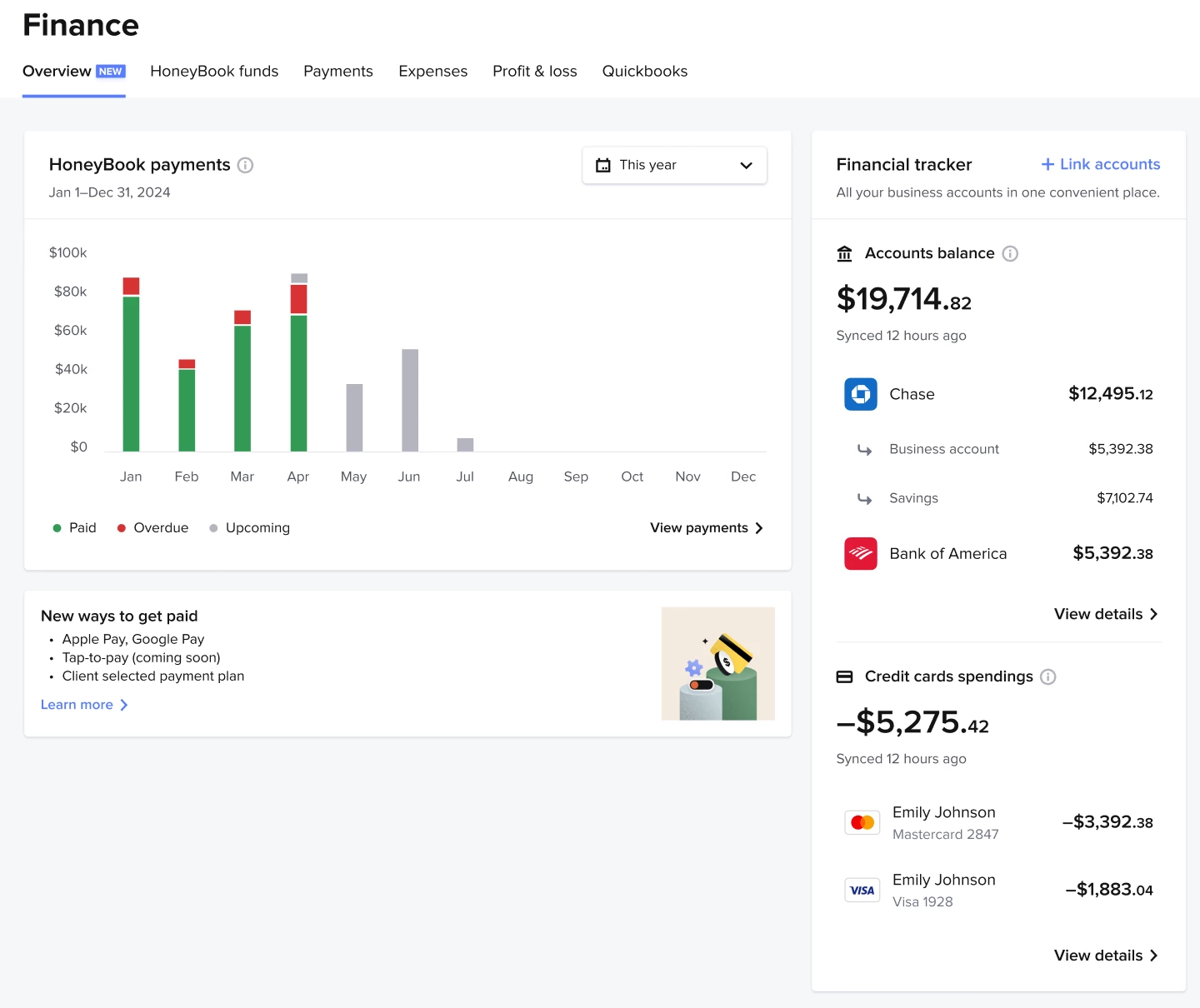 See payments data, cashflow insights, and link your bank accounts and cards from the new Finance Overview page. You’ll have access to personalized metrics and can see how the numbers change over time (such as your expenses month to month).