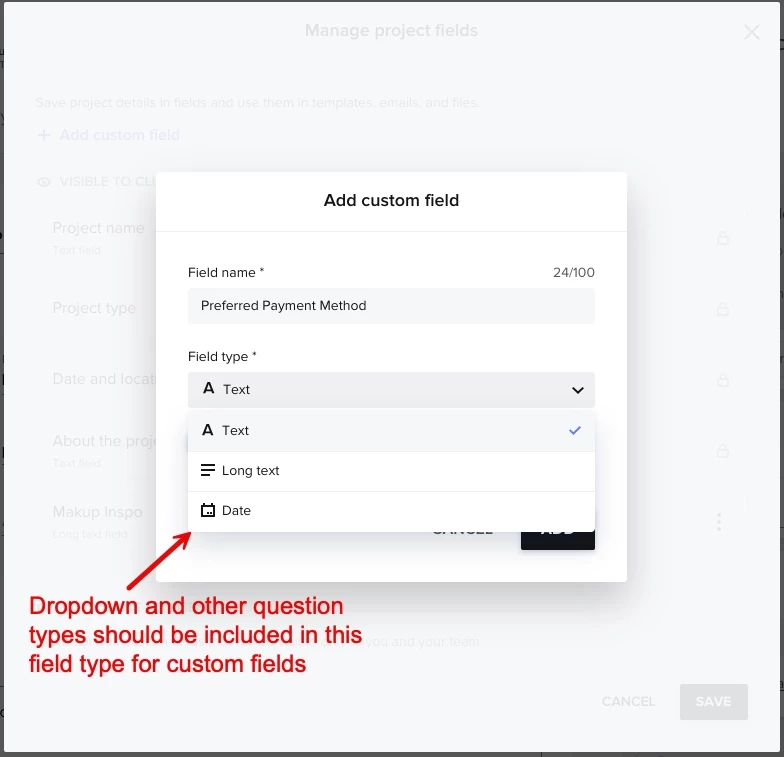 You can now add custom fields for your projects and contacts in HoneyBook. Create custom fields to customize the information you save; then use the fields in files, emails, and lead forms to have details effortlessly populate. The end result? More powerful personalization that saves you the time needed to make adjustments for each and every client and project.