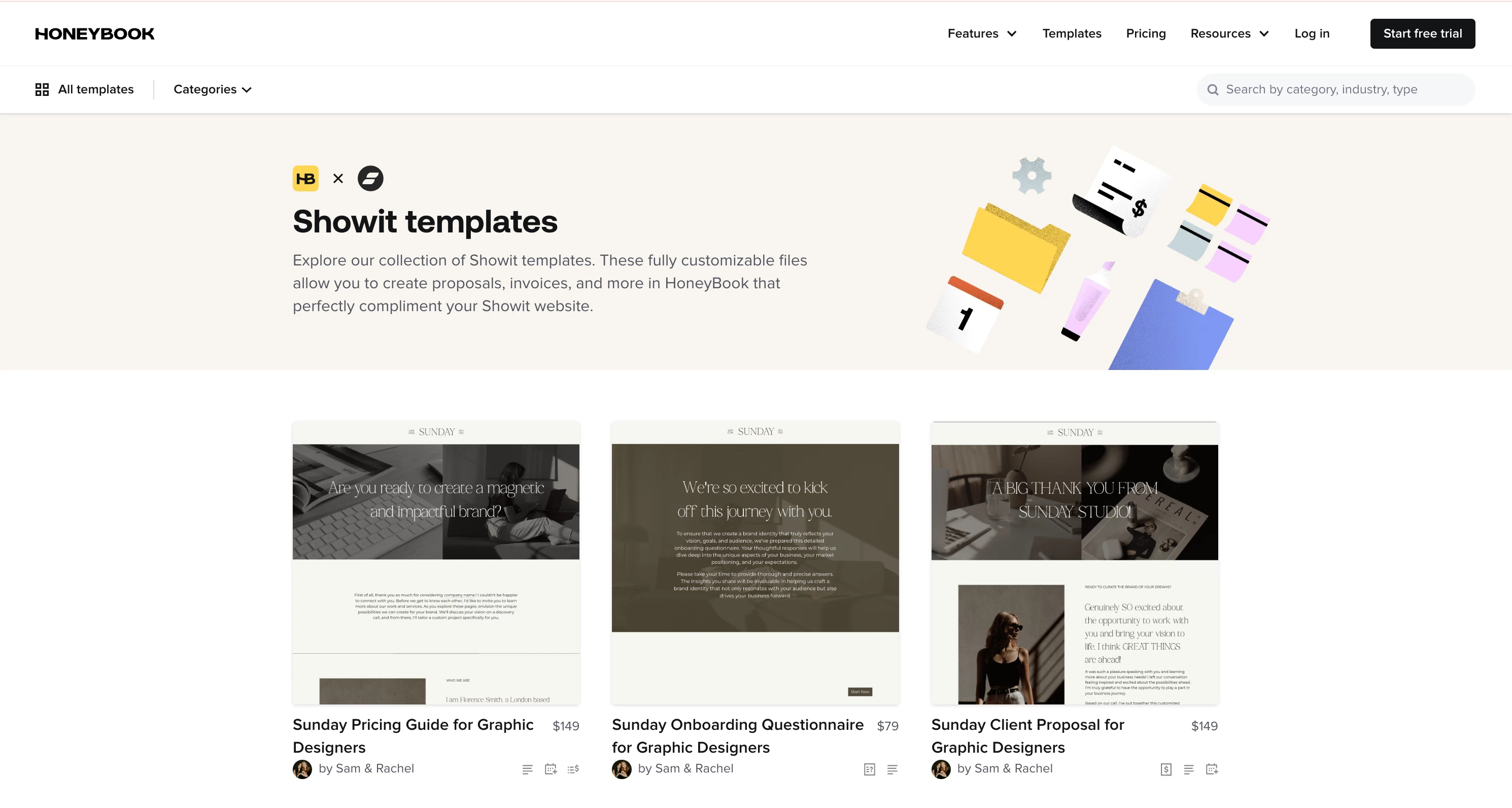 HoneyBook x Showit templates can be found in their own category within the HoneyBook Template Gallery, offering a blend of free and paid templates. These templates are perfect for anyone who use both Showit and HoneyBook, helping you create a seamless, branded experience from start to finish.