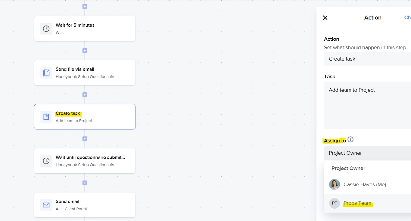 Hi ​@Tina Leisle ! Honeybook Pro here - I am currently setting up automations for a client who has an assistant managing her Honeybook. Because her assistant is added as a team member, I’m able to assign tasks directly to her in Automations.