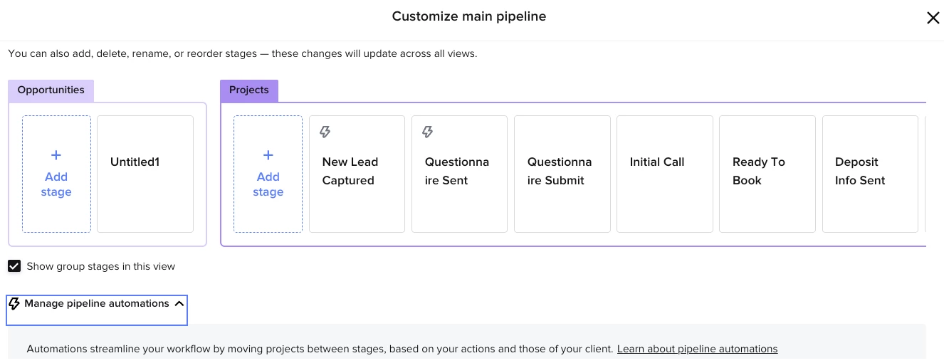 ✨ Pro Tip: You can rename, rearrange, and regroup stages as needed—so this feature is great for evolving workflows and experimenting with how you manage multiple client journeys.
