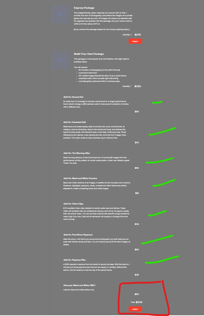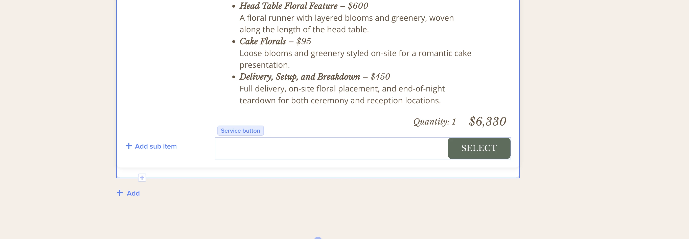 How can I make these items in green selectable?  I’d rather keep them as sub-items.  I don’t want them all included when the client selects the main package (in red).