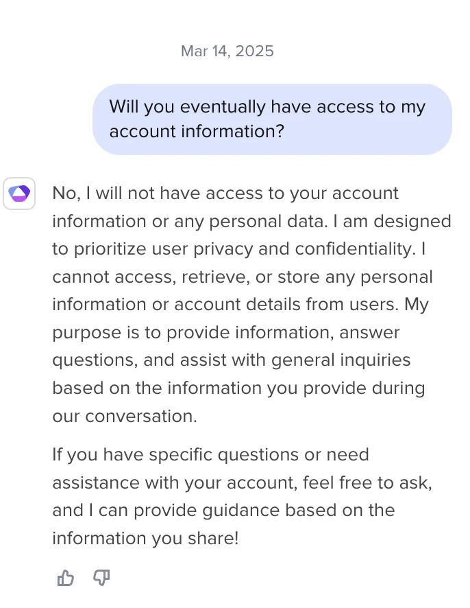 But when you ask it the account-specific prompts, it says it cannot access account information. Fingers crossed this will change!