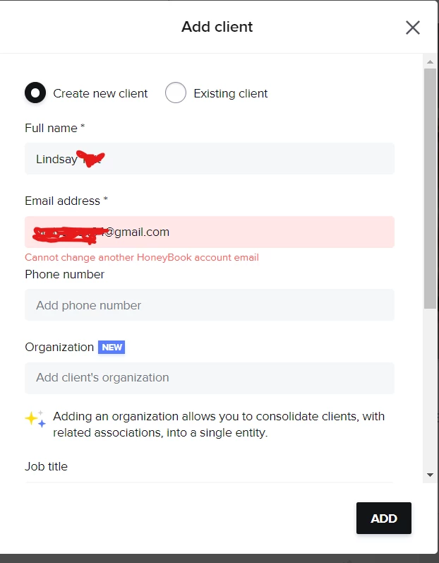 I had an inquiry come through IG, so I wanted to respond to this client through my Honeybook. I created a new project as usual, and went to add her into the workspace as a client. When I type in her name and email, I get this error message under the email address: