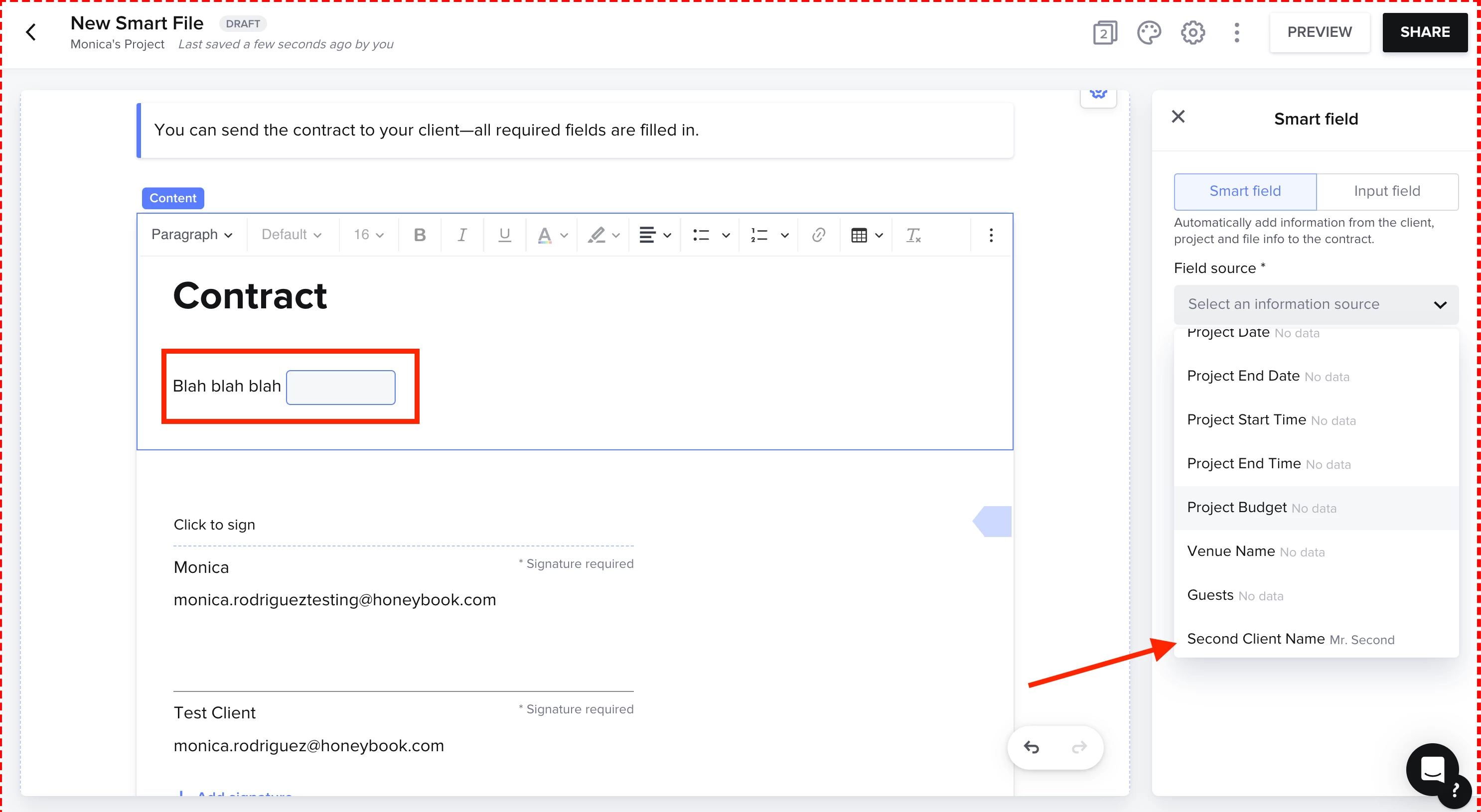 One thing that’s still a little confusing to me about Custom fields is how the Contact and Project custom fields are separate. Even if I add one of these as a custom field, should it go under Contact or Project? and will Honeybook register it properly, or will there still need to be some additional manual work required?