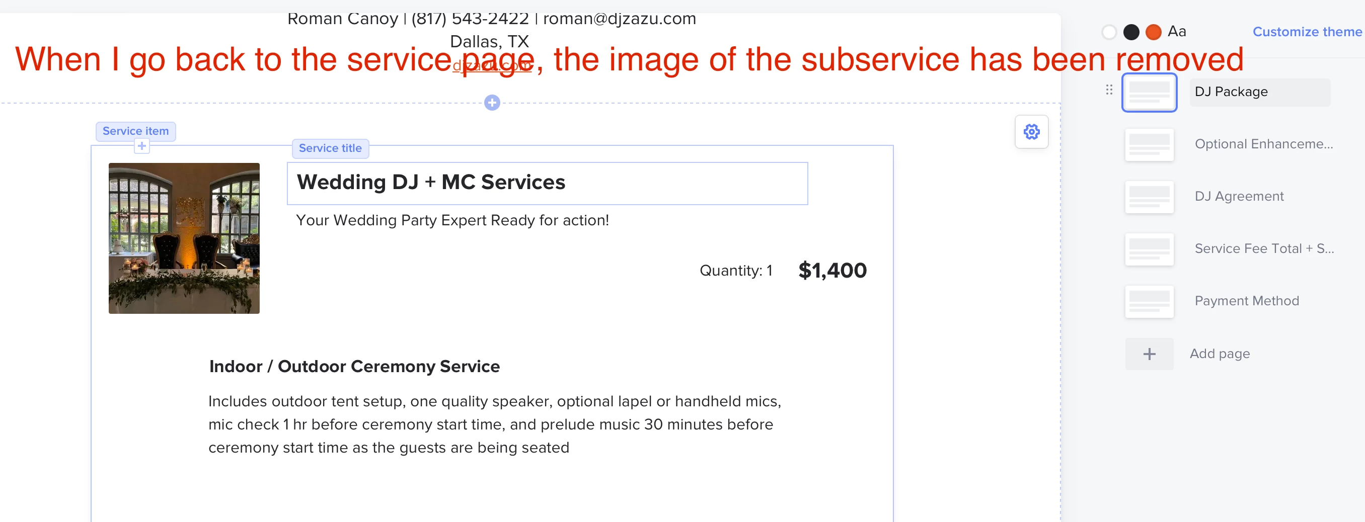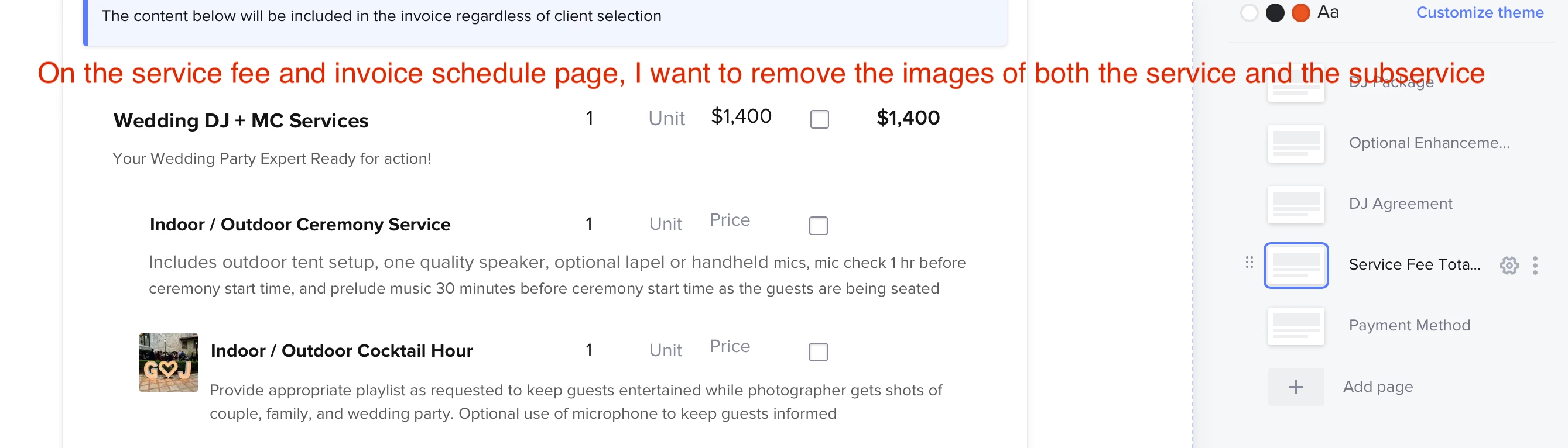 In a smart file on my sub services, I want there to be photos of each of the sub services. However when the client reached the invoice page, I do not want them to see the images attached to the subservices there. If I remove the images in the sub services in the invoice, then the images on the sub services on the services page will also disappear. And this appears to be a bug! Please help!