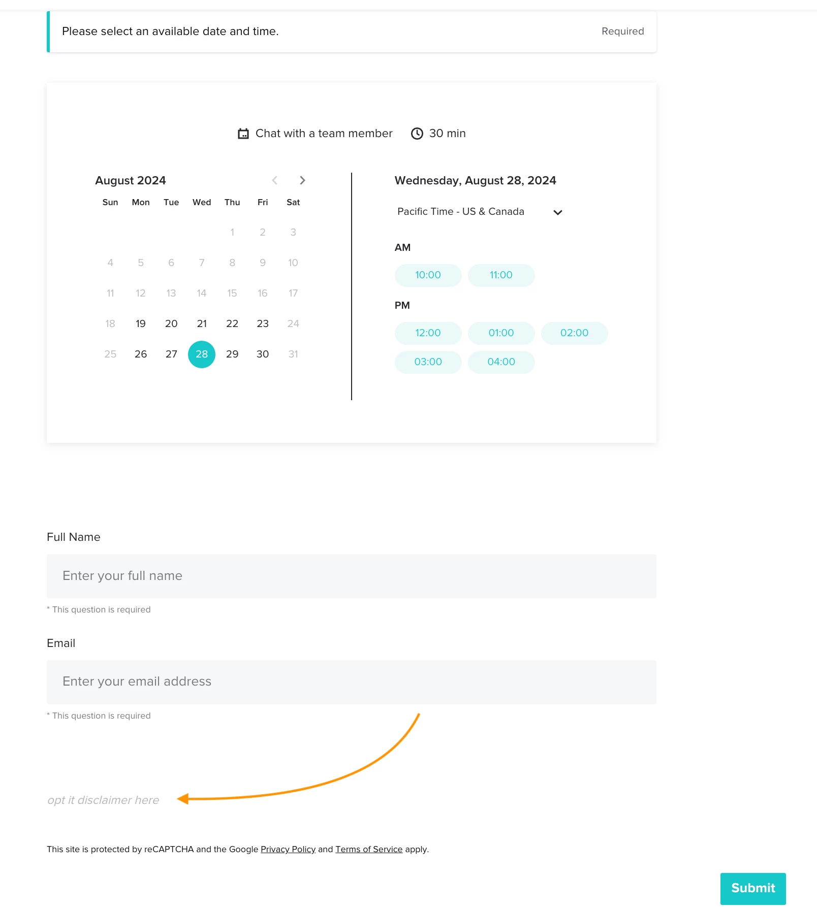 Is there a way to add a check box to “Opt In” to marketing emails in the Scheduler? I have created a new Session Type with the intent of growing my email list, but I believe legally/ethically I should make them aware that this puts them on my list.