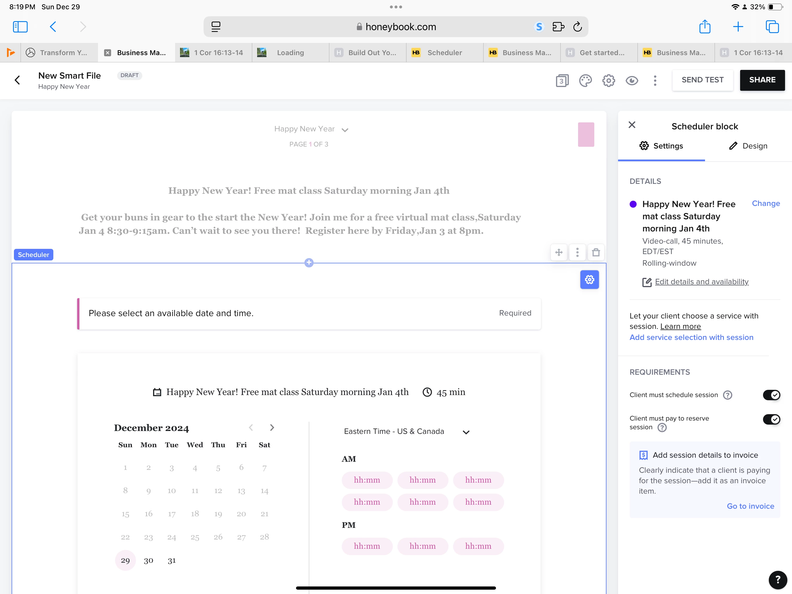 Hi ​@Laura Bonelli, I would click the ‘eye’ symbol to preview your lead form and ensure the proper session type/availability renders. Also is your intention to allow multiple people to book this one (1) class or is it a 1:1 class format? I ask because right now the scheduler isn’t setup for multiple people booking a single session type on a date/time, it’s for 1:1 interactions only.