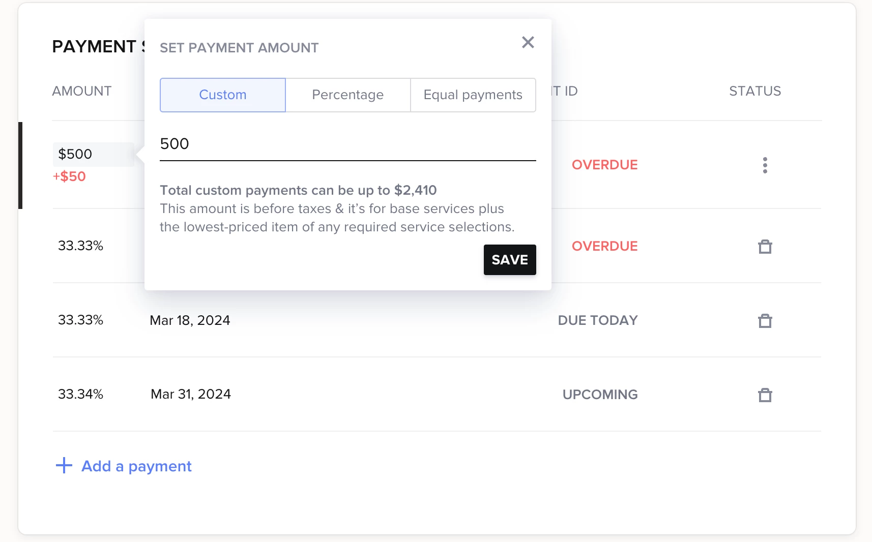 I'm trying to create a proposal where the client chooses their services, pays the invoice and signs the contract all in the one proposal. I'm coming up with a roadblock I'm trying to see if anyone else has figured out. Support was no help. On the invoice, I need the first payment to be a fixed amount, and then the other two payments are split with whatever amount is on the invoice. This fixed amount will literally always be the same, no matter the service they choose. The first payment will not let me make a custom amount (it's grayed out). If I add it from an invoice template, it says the amount is more than the invoice total.