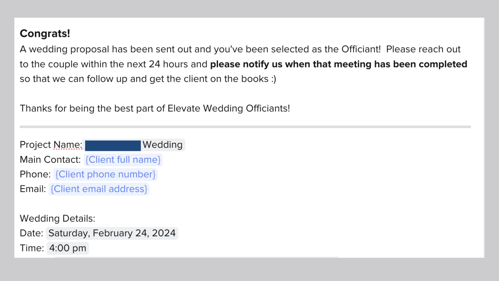 Our goal is to have an email template where we can select fields from the project (client name and contact info) to notify the officiant from the workspace.