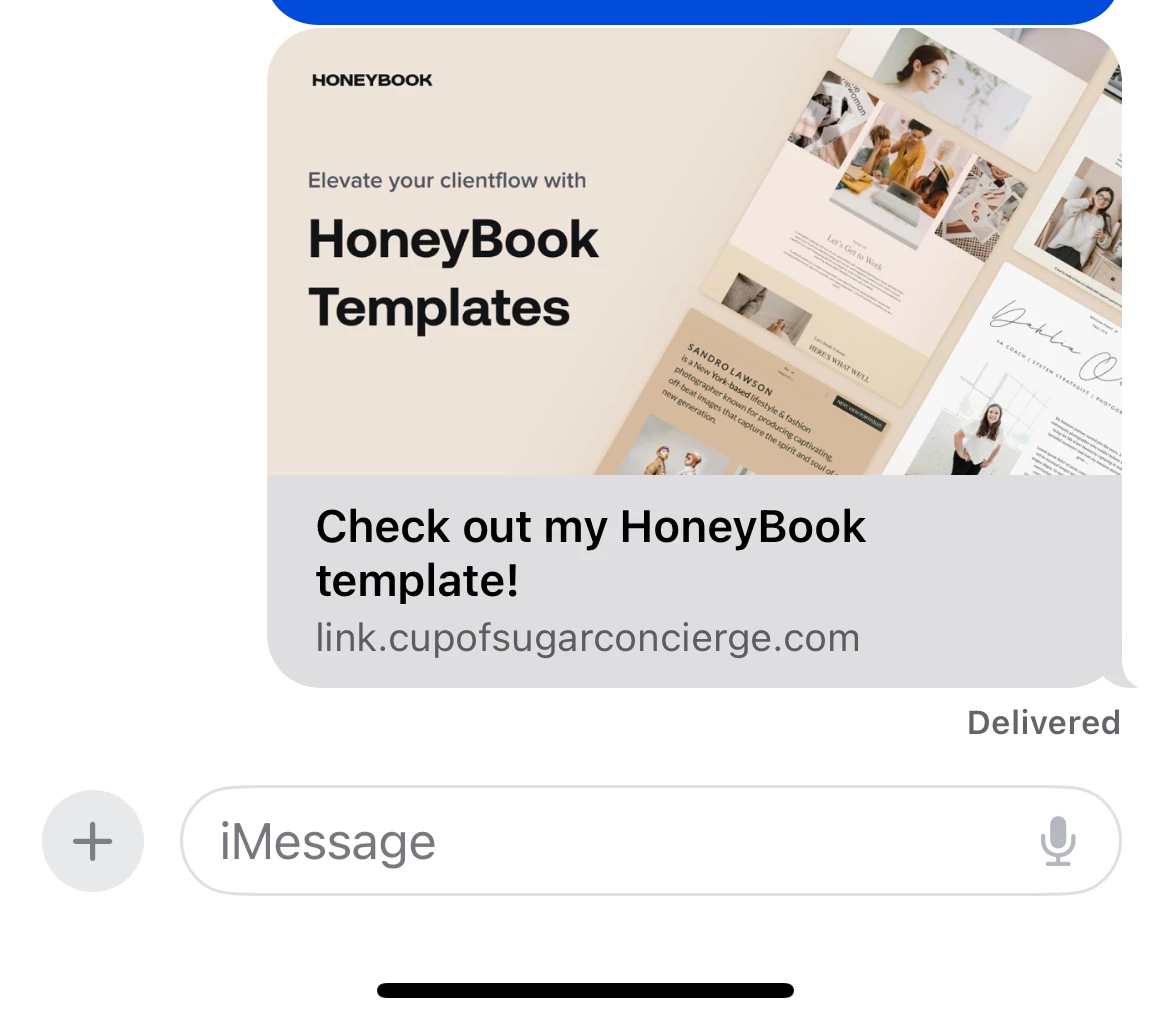 For my cold call marketing leads, I follow up with a text with a link to my smart file template that goes over my services. Yesterday I noticed that when I send the link, this thumbnail saying “check out my HoneyBook template!” Comes up which makes it unattractive for new leads to click because it just looks spammy.