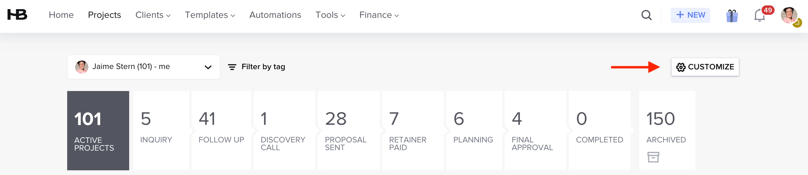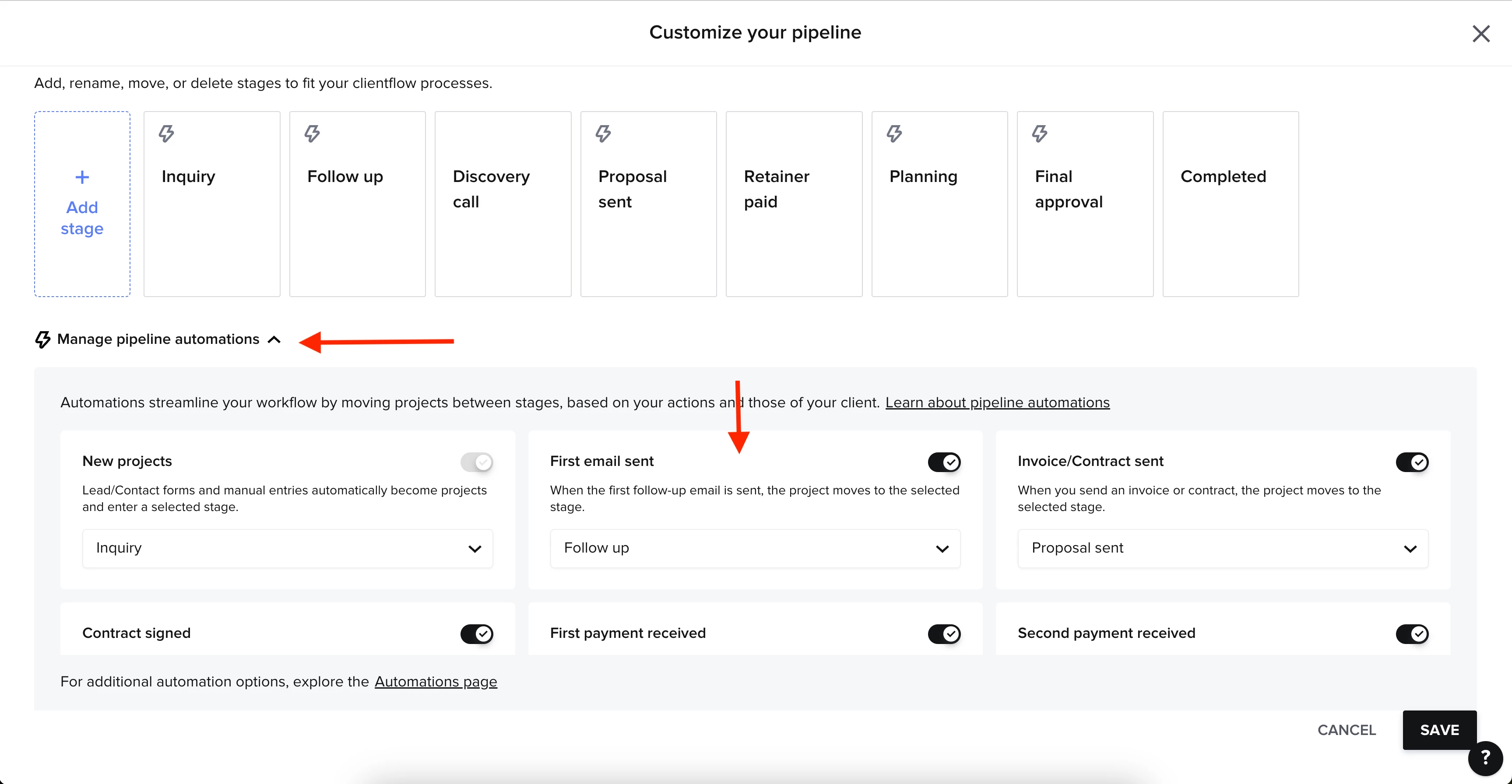 Sending an email in a project automatically moves it to the follow up stage. (this is not an automation I created, it is a built in automation). How do I turn it off? Once I set it to planning, I want it to stay there even if I send the client an email. Once the contract is signed and deposit is paid, I want it to be stage planning and stay there until complete. I used tags and tasks for details within the planning process.